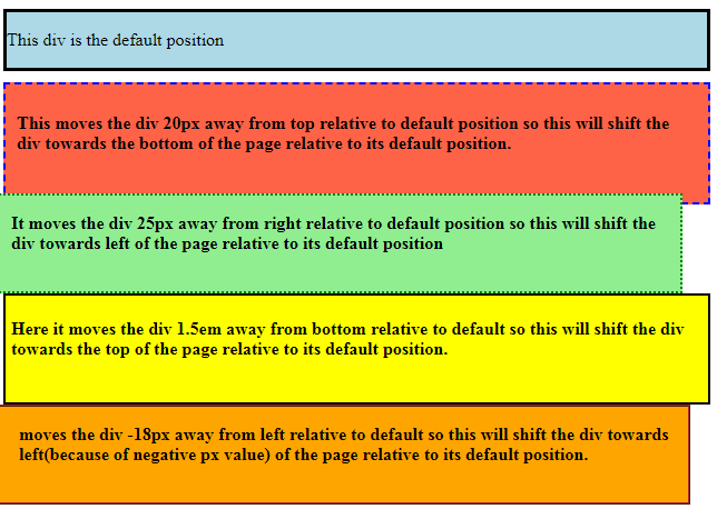 .default { background-color: lightblue; border:solid; } .css_position_relative_top { border: 2px dashed blue; position:relative; top: 20px; padding:10px; background-color:tomato; } .css_position_relative_right { border: 2px dotted green; position:relative; right: 25px; padding:5px; background-color:lightgreen; } .css_position_relative_bottom { border: 2px double black; position:relative; bottom: 1.5em; padding:5px; background-color:yellow; } .css_position_relative_left { border: 2px ridge brown; position:relative; left: -18px; padding:10px; background-color:orange; } .css_position_relative_mix { border: 2px ridge brown; position:relative; top:12px; left: 15px; padding:5px; background-color:aqua; }