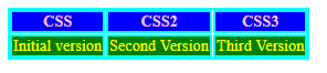 table, th, td { border:2px solid aqua; } tr { color:yellow; background:green; } th { color:pink; background:blue; }