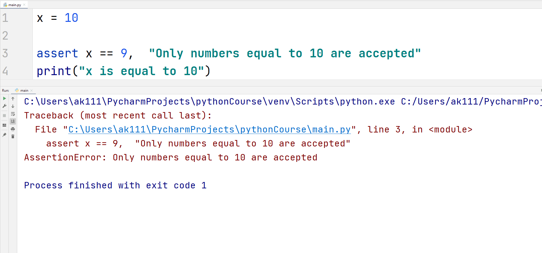 Let’s have another example to get a better insight on what other things you can do with the assert keyword.